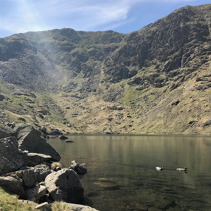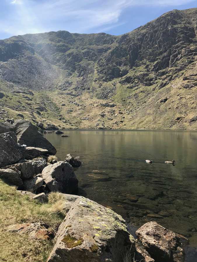 Old Man Coniston may not be the highest point, but is most certainly a walk that’s more scenic with half way up being a small lake filled with mineral water. Although the water was freezing it was fairly clear so is a perfect time to take off your, by this point, heavy walking boots to freshen up your feet. Many other people had the same idea of sitting around for a rest and snacking on their packed lunches, you may even make 2 new friends as a male and female duck have claimed this lake their home. As it was a pretty hot when we climbed Old Man Coniston some brave walkers even took a swim.