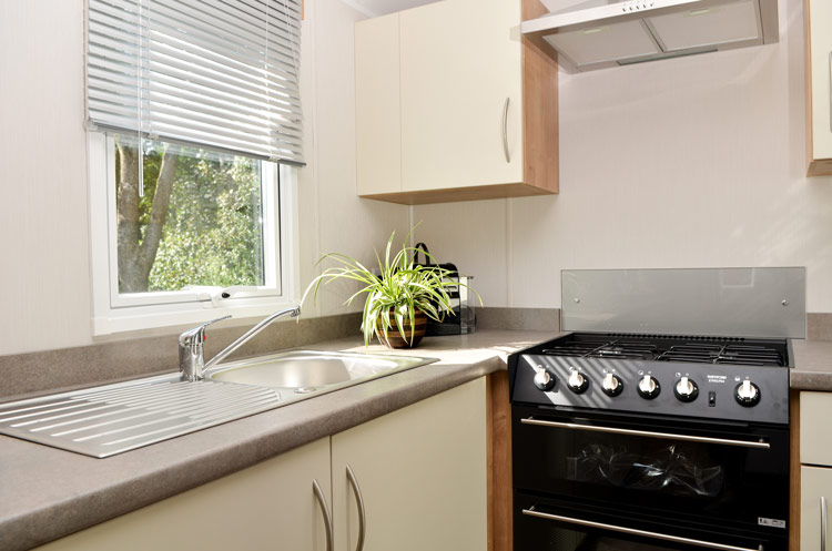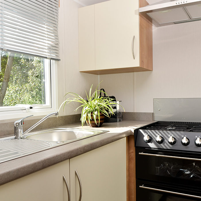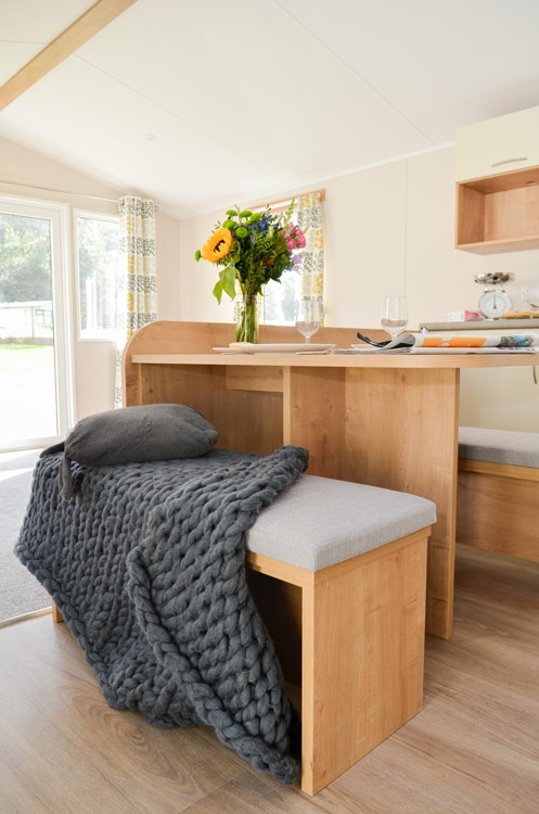 The kitchen area already comes complete with a large fridge freezer and single gas oven with grill. Finished in a neutral colour palette and modern design you can cook with practical worktops and maximum cupboard storage. Having the dining table placed into the kitchen area rather than off to the side like many other holiday homes, makes the Grasmere all the more unique and can even prove a great kitchen island surface to work off as well.