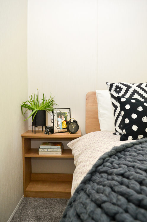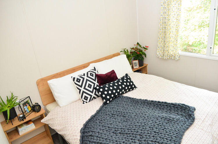 If you’re someone who likes to hike in the countryside, then the bedroom is ideal to store all your hiking gear. Around a corner of the bedroom is an almost walk-in-wardrobe tucked away to keep the mess hidden so you can still feel peace whilst you sit in bed. Not only is this great if you’re a hiker, but great if you’re a hoarder of clothes- many of us guilty of that one. As this is a more affordable holiday home the storage is more simplistic with shelving units compared to draws, but can make a great statement to display all off your belongings. If you like organisation then IKEA organisers can help to give you the illusion of draws.